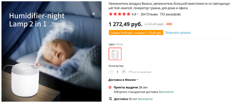 Компактный и бесшумный увлажнитель воздуха от Baseus (актуальное устройство для грядущего отопительного сезона, во время которого воздух становится слишком сухим, что вредно), который также может служить ночником. Два режима работы, емкость на 600 мл, защита от опрокидывания (вода не прольется), хорошие отзывы.
