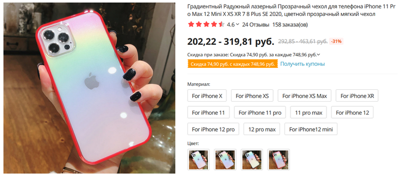 Градиентный радужный прозрачный чехол для айфонов различных моделей. Цвет окантовки выбираете сами. В таком чехле задняя крышка айфона хорошо видна, при этом с цветной окантовкой это все выглядит интереснее, чем с обычным прозрачным силиконовым чехлом.