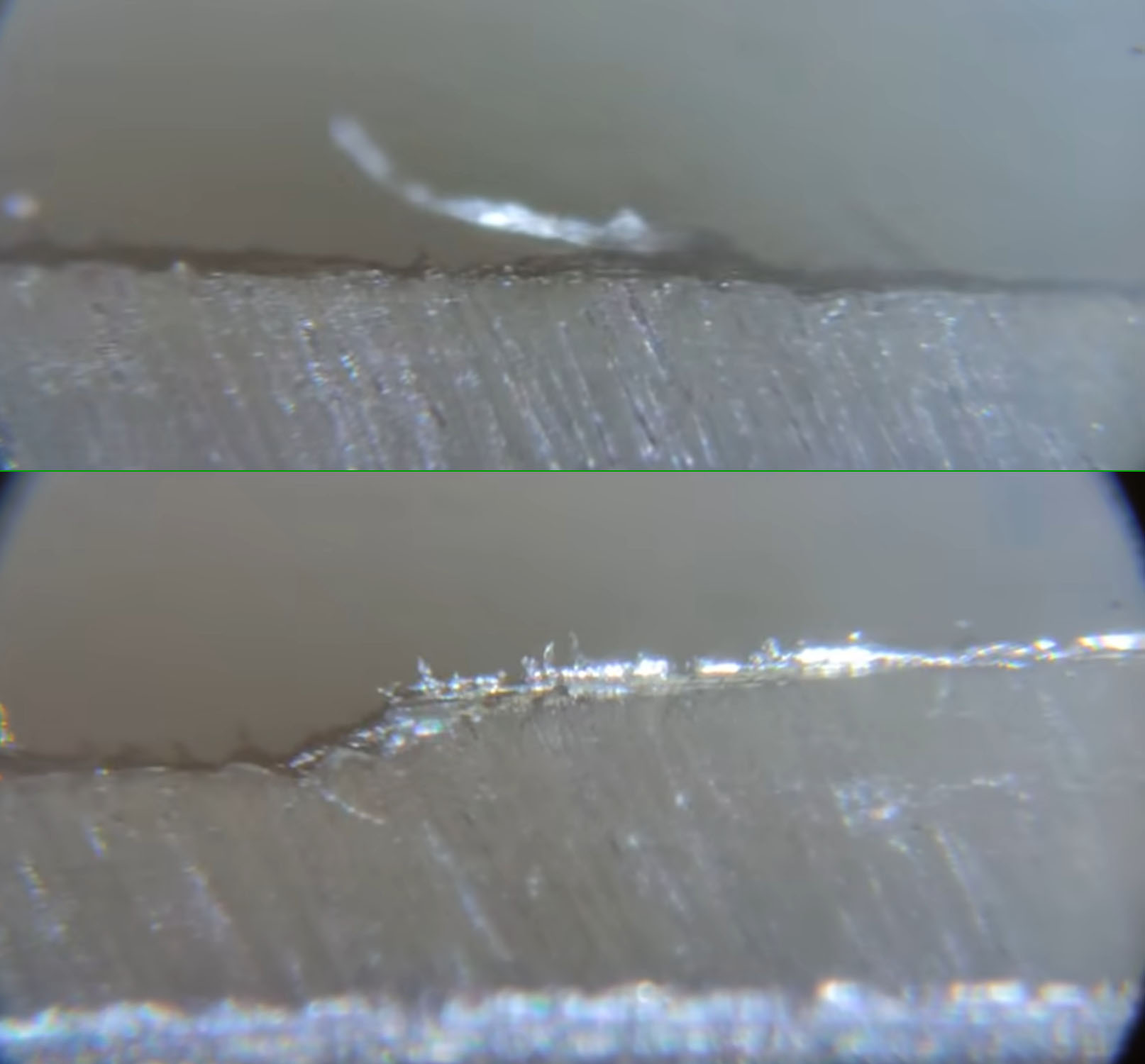 Ну, отваливающиеся кусочки я видел после грубых точилок и после достаточно долгого их применения. Также на ножах из стали высокой твердости часто прямо пальцем можно нащупать сколы кромки. После вашей вряд ли там будет прямо разломанная сталь, но способ все равно тот же, и борозды она протащит также продольные на кромке, просто мельче. Удобно конечно, быстро и просто, но при этом надо понимать, что это не очень хороший способ.