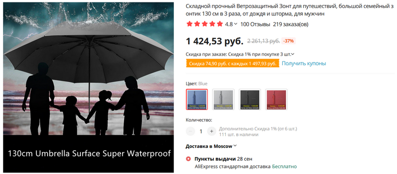 А кто-нибудь может посоветовать зонт-трость?Не обязательно с Али. Чтобы был (а) большой, мин 130 см в диаметре, (б) достаточно качественный, (в) не слишком тяжёлый.