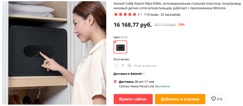 Умный сейф от Xiaomi. Выполнен из стали, устойчивой к повреждениям. Открывается с помощью отпечатка пальца, с помощью кода, комплектного ключа и через приложение MiHome. Верификация двухфакторная, есть крепеж для крепления сейфа к стене.