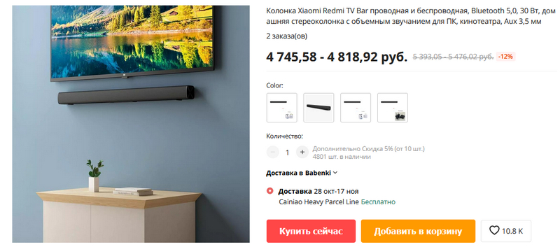 Недорогой саундбар Xiaomi Redmi TV. В комплекте два широкополосных динамика мощностью 15 Вт каждый. Подключение может осуществляться помощью Bluetooth 5.0, S/PDIF и 3,5-миллиметрового AUX. На корпусе  находятся кнопки управления. В комплект входит крепеж для стены.