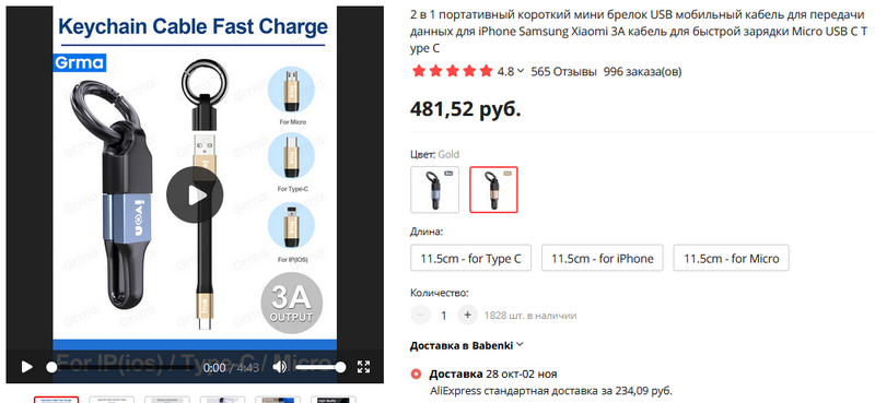 Мини-брелок в виде короткого зарядного кабеля. Есть трех типов - Type-C, microUSB и Lightning.