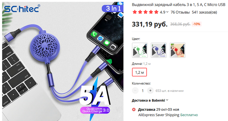 И еще в тему кабелей. Сворачивающийся компактный зарядный кабель длиной 1,2 м со всеми тремя типами головок. То есть заменяет целый клубок проводов. Поддерживает быструю зарядку QC 3.0.