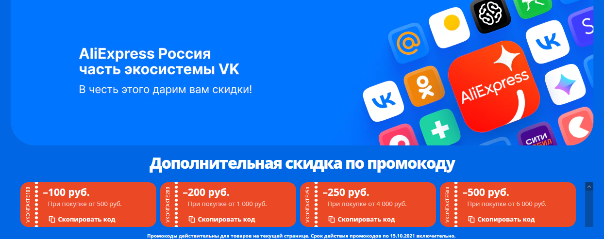 AliExpress Россия стали частью экосистемы ВКонтакте и сегодня поделились эксклюзивными промокодами, которые действуют до 15 октября (включительно) или до конца активаций на ВСЕ товары.