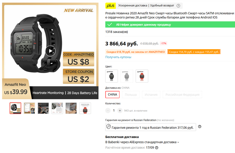 У часов черно-белый дисплей размером 1,2", который всегда включен. Производитель уверяет, что при активном использовании от одного заряда часы живут 28 дней. С промокодом AMAZFITNEO дают 20% скидки от и так-то невысокой цены. Промокод проверил, срабатывает.