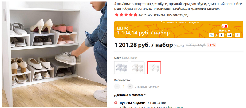 Из разряда полезной бытовухи. Мало места для обуви, не помещаются ботинки? Покупаете вот этот набор из четырех полок, после чего место для обуви увеличивается взрывообразно. Ну, если и не взрывообразно, то в два раза - точно!