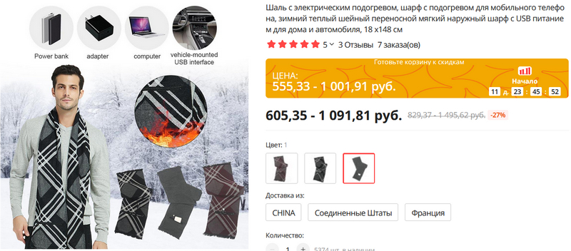 Ну и раз тема зимы как-то не отпускает (мне в Испании, понятное дело, это все по барабану, я на прогулки круглый год в майке хожу, но переживаю за соотечественников из далекой заснеженной России-матушки), еще одна полезная вещь, обеспечивающая тепло и комфорт, - шарф с нагревающимися элементами. Три вида расцветки, подходит как мужчинам, так и женщинам. Работает от обычного внешнего аккумулятора (у шарфа есть специальный карман для него), который в комплект не входит.