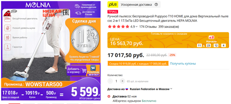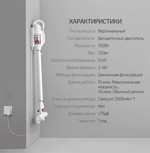 Дешевый беспроводной пылесос "2 в 1" Puppyoo T10 HOME. Бесщеточный двигатель, циклонный фильтр, дополнительные насадки, настенный держатель, подсветка у турбощетки. Может работать и в качестве ручного пылесоса. Пишут, что довольно тихий. Мощность 250 Вт,  сила всасывания - 16 кПа. Там вроде как указано, что на него дается сумасшедшая скидка (купоном можно получить скидку более 10 тысяч, также промокодом можно скинуть еще 500 рублей и получить конечную цену в 5599 рублей), но я, собственно, об этом и пишу, чтобы вас предупредить о том, что скидка - фейковая (просто этот пылесос "с огромной скидкой" сейчас много где пиарят). Я проверил - у нас этот пылесос продается за €70 без всяких скидок (это примерно 5700 рублей). Но вот за 5599 рублей - это как раз может быть неплохой вариант для тех, кому нужен дешевый пылесос с подобной функциональностью.
