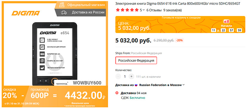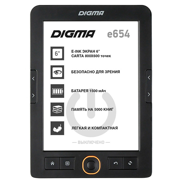 Подбирал родственнику дешевый шестидюймовый ридер. Нашел вот это - Digma E654. Самый обычный шестидюймовый ридер, бумага - E-Inc Carta, разрешение - 800х600. Встроенная память 4 Гб, поддержка карт micro SDHC. Управление - кнопками. Доставка с российского склада. Цена со скидками и промокодом - 4432 рубля, совсем дешево.