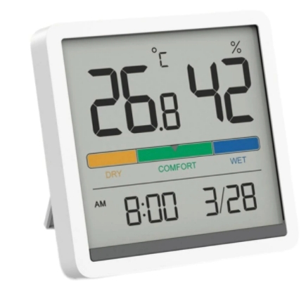 Датчик температуры/влажности от Xiaomi. В отличии от маленьких датчиков, в этом встроены часы, так же в наличии большой экран и указание зон комфорта. Естественно, датчик работает в системе умного дома. По нему можно включать различные кондиционеры и увлажнители воздуха. А по встроенным часам открывать/закрывать шторы.