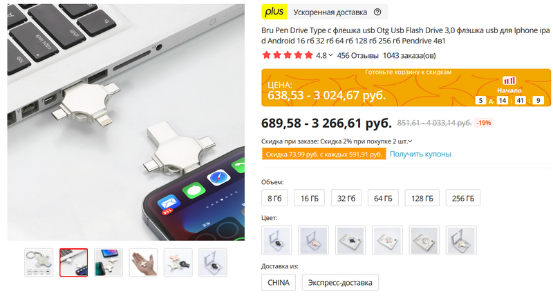 Универсальная флешка со всеми типами разъемов: под ПК-ноутбуки, айфоны/айпэды, смартфоны с Type-C или microUSB. Емкости от 8 до 256 ГБ, есть ушко для прикрепления флешки к ключам. С ключами флешка будет классно смотреться, ее можно использовать как брелок. Причем можно даже и не использовать ее как флешку - просто как крутой брелок. Не у всех есть брелок на 256 гигов, правильно?
