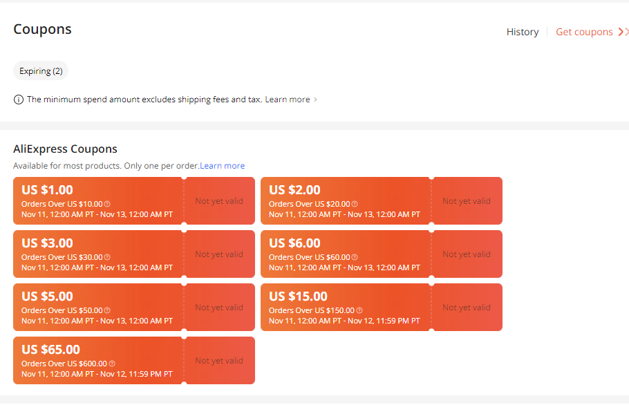 А вот пример накопленных купонов ("Мой Aliexpress" -> "Мои купоны")