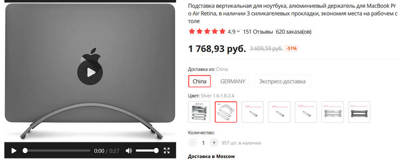 Подставка для ноутбуков, чтобы держать их на столе в вертикальном положении, что, знаете ли, очень сильно экономит место. Позиционируется как подставка для макбуков трех размеров от 13 до 16 дюймов (при этом дешевле оригинальной подставки в несколько раз), однако я - не гордый, я туда и свой Xiaomi Mi Notebook Pro 15,6 поставлю, благо он мало чем отличается внешне. Есть серая подставка с силиконовыми вставками под разные размеры, есть серебристая. Я заказал серую: как приедет, поделюсь впечатлениями - давно такую хотел купить, а то раздражает, что ноутбук лежит на столе, когда он не нужен.