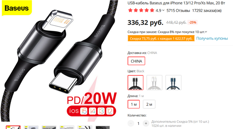 Эмм... странно видеть кабель для Apple за 329 рублей.