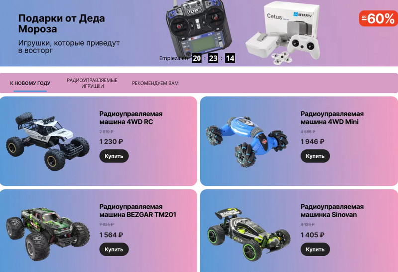 Также с 11 по 18 декабря проходит другая акция "Подарки от Деда Мороза", где обещают скидки на различные игрушки (от плюшевых до радиоуправляемых), и там тоже все с доставкой из России.