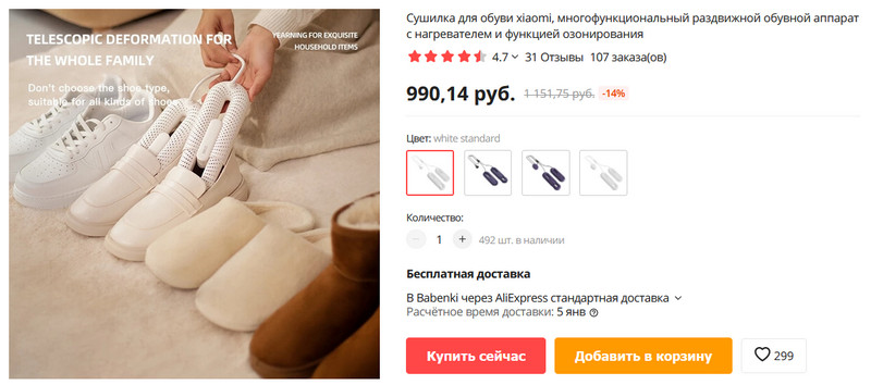 Очень актуальная для зимнего времени сушилка для обуви от Xiaomi. Гибкая, выдвигаемая (поддерживаются размеры 28-45), нагревается за 15 секунд, обладает антибактериальным действием.