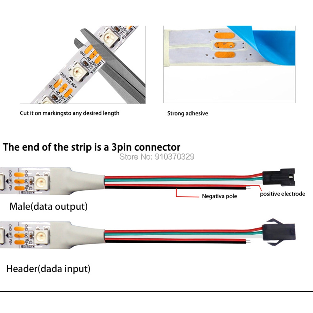 На картинке, приведенной мной в предыдущем комментарии, маркировка на линии отреза выглядит как +5V, Din(Dout),Gnd, то есть: питание, цифровое управление, "земля".