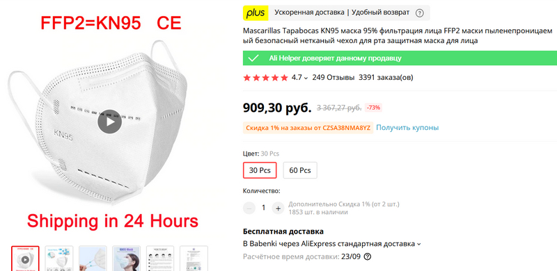Ну и, понятное дело, неудивительно, почему в первой пятерке самых популярных товаров - комплекты масок FFP2 (KN95) по 30 или 60 штук. Этот товар, я боюсь, будет популярным еще долго.
