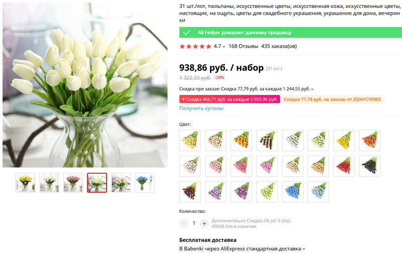 Почему-то в табличке была ссылка на вот эти искусственные тюльпаны различных цветов. Я там не вижу, чтобы они были страшно популярны, но в отзывах пишут, что выглядят как живые, так что я заказал: жена любит тюльпаны, я периодически дарю, но живые стоят всего дня три, да и жалко их, а эти если прилично выглядят - пускай стоят, радуют глаз.
