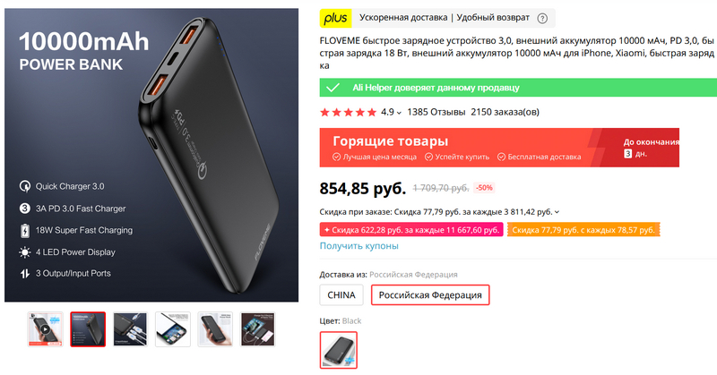 Внешний аккумулятор Floveme на 10000 мА·ч. Полный фарш: поддержка QC 3.0, PD 3.0, быстрая зарядка 18 ватт, зарядка до трех устройств. С российского склада доставка 246 рублей, но все равно дешево получается.