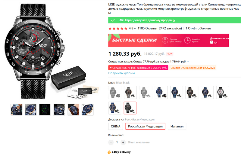 Мужские кварцевые часы LIGE. Есть доставка с российского склада, куча вариантов цветового оформления: от золота с голубым ремешком до вполне сдержанного в стиле сталь и черный металл. Топ люкс супермегабренд аудемар пиге эдишн - аж за 1280 рублей. В отзывах куча реальных фото, выглядят очень пристойно. Ну и ломаться там особо нечему - кварц и кварц. Я писал о китайских кварцевых часах за 1 евро, которые и выглядят прилично, и проработали, не сильно отставая от реального времени, больше года, лежа у меня на полке.