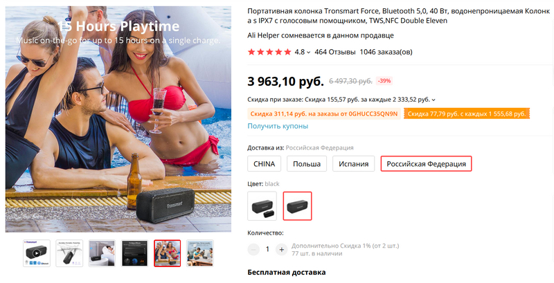 Влагозащищенная беспроводная портативная колонка на 40 ватт. Три варианта звучания, до 15 часов от одного заряда. И промокод 0GHUCC35QN9N к ней дает скидку на $3 - хоть что-то.