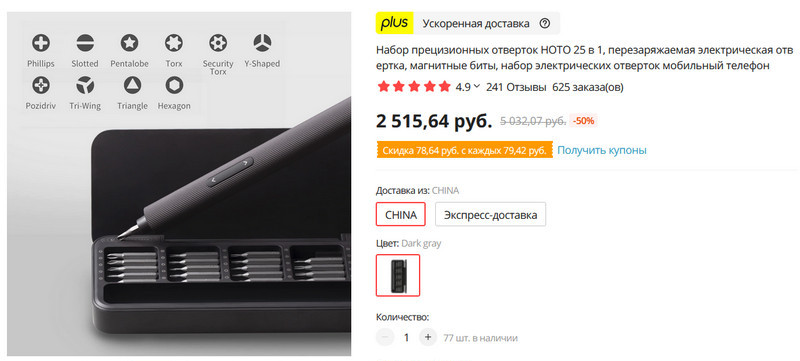 Всегда полезный в быту набор из перезаряжаемой электрической отвертки, 25 наиболее часто используемых бит к ней, и все это в удобном пластиковом кейсе. Я себе сдуру купил похожий набор от Xiaomi, но без кейса - пользоваться приходится нередко, и это неудобно: биты приходится вываливать на стол, искать нужную, а потом все засовывать обратно. Здесь заметно удобнее.