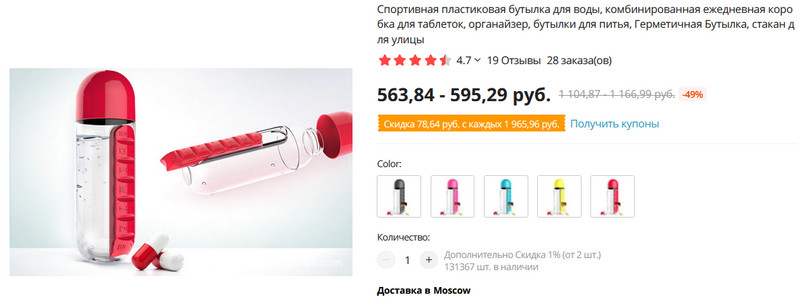Любопытно придумано - емкость на 600 мл с герметичной крышкой, а в емкость встроена таблетница. Для прогулок, для небольших поездок, в офис с собой брать и так далее.