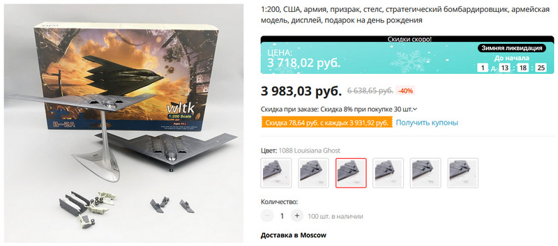 Кстати, о легендарном невидимом бомбардировщике Northrop B-2 Spirit. Искали с сыном у китайцев модельку - на стол поставить. В основном попадалось только дешевое пластиковое барахло с нарисованными элементами. Но вот нашли модельку недешевую, но зато из металлического сплава, а обвес - из пластика. И они пишут, что это не игрушка, а именно модель.