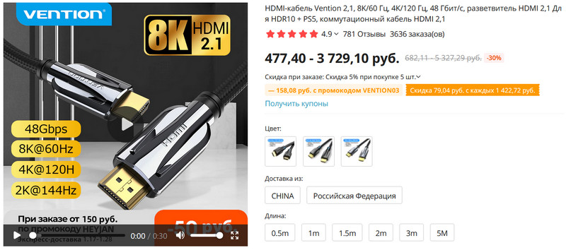 Современные телевизоры с разрешением 4К или больше, с повышенной частотой развертки - требуют кабеля, который бы это все поддерживал. HDMI-кабель от известного производителя с поддержкой разрешения до 8К/60 Hz (4K 120Hz, 2K 144 Hz), шесть вариантов длины, есть доставка с российского склада.