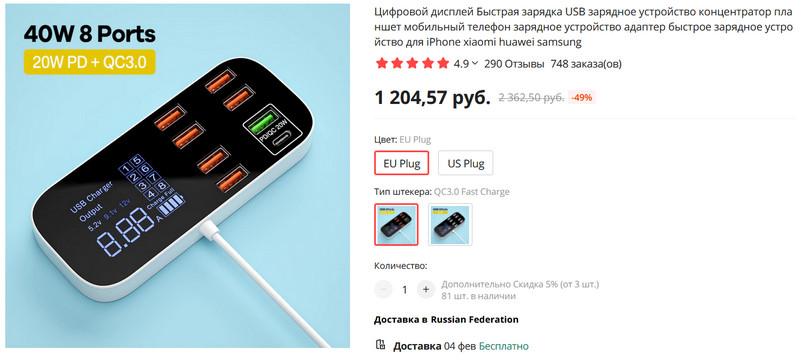 8-портовый зарядник на 40 ватт с одним портом Type-C и семью выходами USB-A. Разъем Type-C поддерживает стандарт PD 3.0 и выдает до 20 ватт, соседний с ним Type-A, поддерживает QC 3.0 с мощностью 18 ватт. Остальные порты поддерживают мощность 10 ватт. Может лежать на столе или крепиться на стену. Есть дисплей, который показывает параметры зарядки на каждом порте.