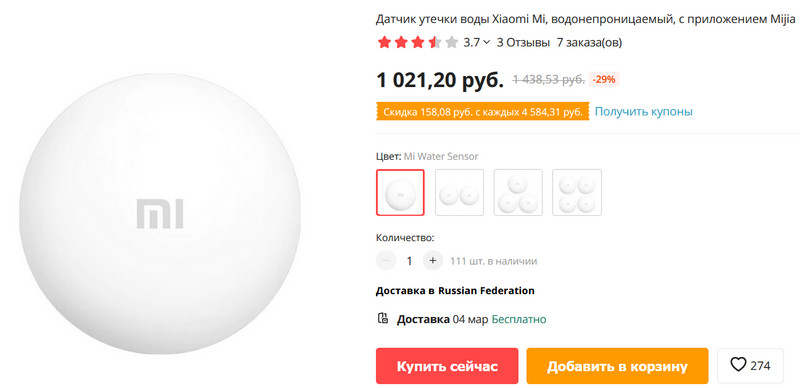 Прямо-таки необходимая в быту вещь - датчик протечки воды от Xiaomi. Совместим с приложением Mi Home.