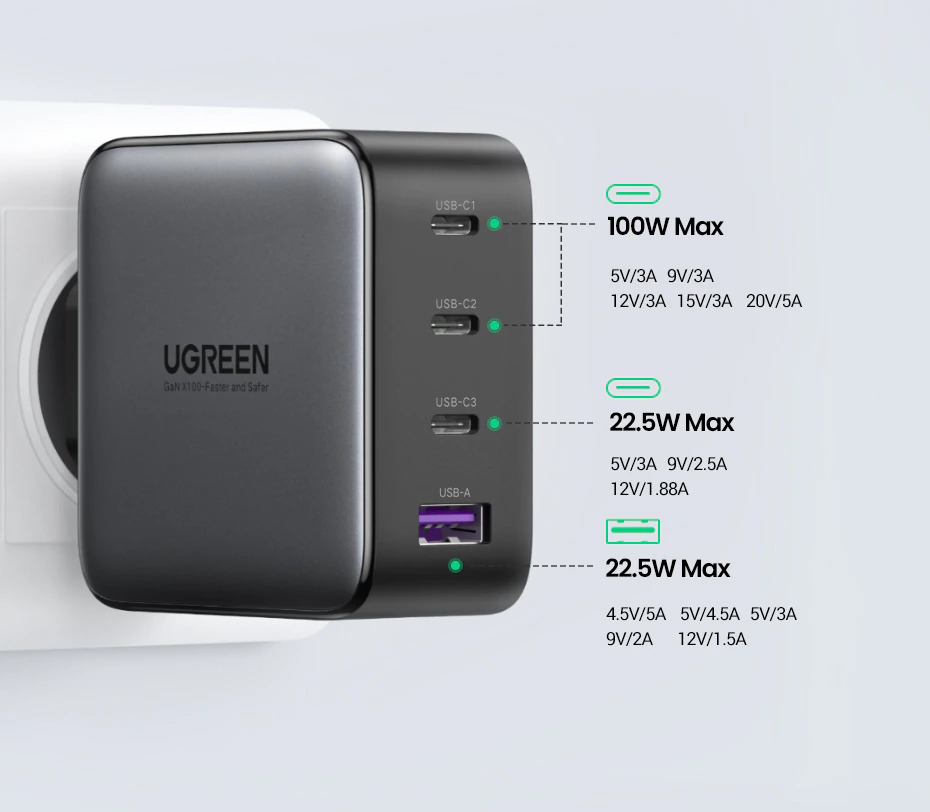 Зарядная станция GaN с четырьмя портами, поддерживающая мощность до 150 ватт. Type-C до 65 ватт, Type-A до 22 ватт. Такой адаптер способен питать одновременно два ноутбука - на 87 и 65 ватт. Поддерживаются стандарты быстрой зарядки Power Delivery 3.0, Quick Charge 3.0, Quick Charge 4.0. В комплекте можно взять двухметровый кабель Type-C, который поддерживает мощность до 100 ватт.