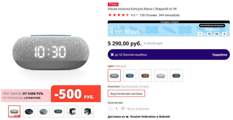Для российских пользователей - колонка-мини с "Марусей". При помощи этой колонки можно управлять техникой умного дома, переписываться с друзьями голосом во "ВКонтакте", слушать музыку из любых сервисов. Пять вариантов цветов.