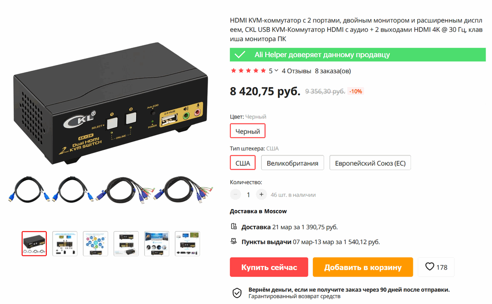 При заказе одной штуки и применения промокода "WARMHOME100" цена составить 240 рублей. Достаточно быстрая доставка из России. Можно успеть к 8-му марта.