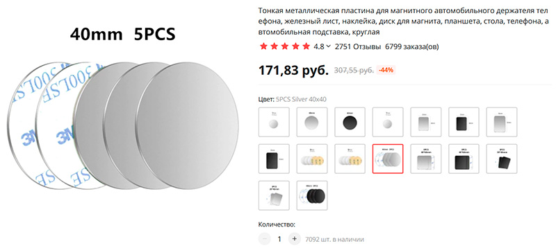 Большой выбор круглых и прямоугольных металлических пластин для крепления смартфона к магнитному держателю в автомобиле. Двух цветов, различных размеров. Есть наборы из нескольких штук. Я себе в свое время купил такой набор, и это все очень даже пригодилось.