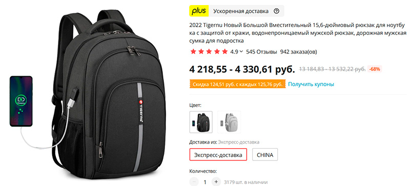 Рюкзак соответствует своей цене 40$: внутренние стенки из одного слоя ткани, нет карманов под технику, документы. У меня в подобном через месяц посыпалась ткань на швах. В общем, вещьмешок.