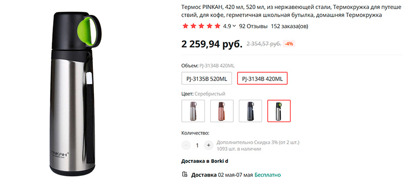 Термос из нержавеющей стали емкостью в 420 или 520 мл. Есть различные варианты цветов. Завинчивающаяся пробка с клапаном легко разбирается для промывки, чашка-крышка имеет удобную ручку, позволяющую не обжигаться при использовании горячих напитков. Также термос имеет съемную петлю-шнурок для переноски.