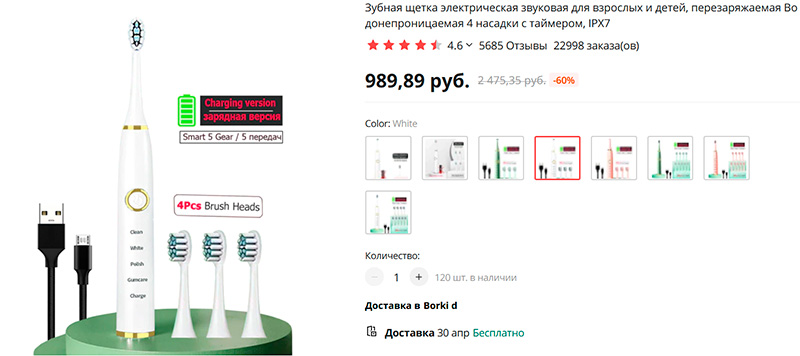 Недорогие электрические зубные щетки различных цветов и двух видов: самые дешевые, работающие от батарейки (батарейка в комплект не входит), и более продвинутые, имеющие встроенный аккумулятор,  несколько режимов работы и таймер с вибрацией. Есть вариант комплектации с тремя, четырьмя и даже десятью сменными головками. (Напомню, что головку электрической зубной щетки полагается менять каждые три месяца.)