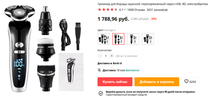 Недорогая влагозащищенная роторная электробритва для сухого и влажного бритья, с дисплеем и несколькими дополнительными насадками: триммер для стрижки волос (для бороды), триммер для носа, кисть для очистки лица. Заряжается через порт USB.