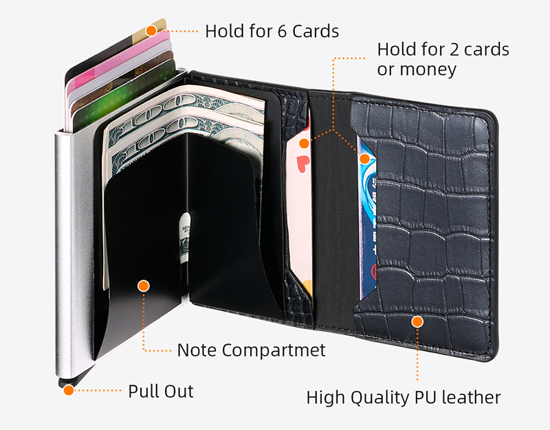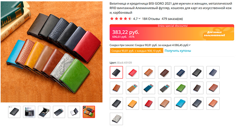 Большой выбор компактных алюминиевых кошельков с покрытием из искусственной кожи различных цветов, с защитой от считывания RFID и с механизмом, позволяющим вытаскивать нужную карту легко и быстро. В кошелек помещается восемь пластиковых карт и немного налички. Такой кошелек поместится даже в карман джинсов: его размеры - 6,5 на 10 см, толщина - 1,8 см.