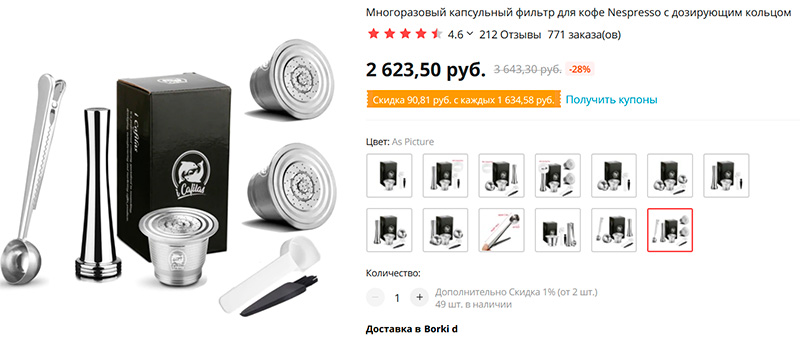 Если же хотите из этой серии что-то более надежное и со всякими аксессуарами вроде насыпной ложки, утрамбовывателя кофе, кисточки для чистки, то вот многоразовые металлические капсульные фильтры. От 800 рублей за один контейнер с мерной ложкой и кисточкой для очистки до большого разнообразного набора.