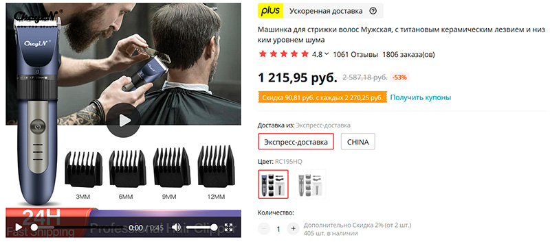 Из той же серии - недорогая машинка для стрижки волос. Два ножа - керамический и титановый. С помощью кольца на рукоятке можно устанавливать длину среза от 0,8 до 2 мм. В комплекте также идут четыре насадки, которые помогают укоротить волосы до 3, 6, 9 или 12 мм. Время непрерывной работы - час, уровень заряда показывает световой индикатор. Для полной зарядки машинки потребуется 8 часов. Есть быстрая доставка из России.