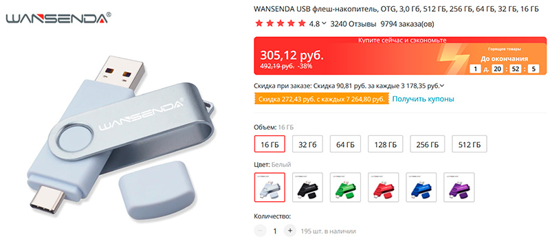 Универсальный флеш-накопитель с емкостью от 16 до 512 ГБ, позволяющий работать как с ПК/ноутбуками через порт USB-A, так и со смартфонами/планшетами с портом USB-C OTG.