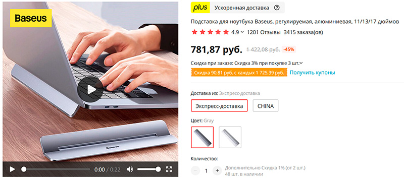 Удобная подставка для ноутбука от Baseus из алюминиевого сплава. Подставка клеится к ноутбуку, не оставляя следов. Половина подставки раскрывается и приподнимает ноутбук над столом на угол до 8 градусов. В таком режиме и удобнее работать на клавиатуре ноутбука, и устройство лучше охлаждается. Подставка тонкая, всего 3 мм, она не будет мешать пользоваться чехлами. Есть двух цветов, есть доставка с российского склада.