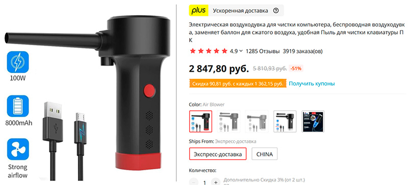 Мощная (40 000 об/мин) электрическая воздуходувка, способная очищать от пыли различные поверхности, включая труднодоступные: клавиатура, компьютер, фотокамеры, кондиционеры, смартфоны и так далее.