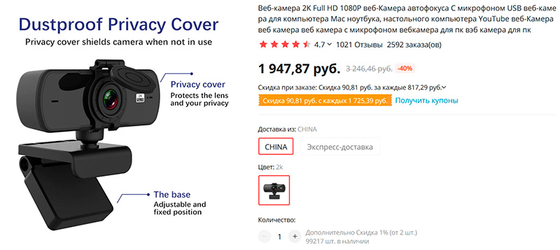 Недорогая веб-камера с разрешением до 2К (2560 x 1440) и защитной шторкой. Может устанавливаться на монитор, на стол, на штатив. Имеет встроенные микрофоны с шумоподавлением, передающие голос с расстояния до 3 метров.