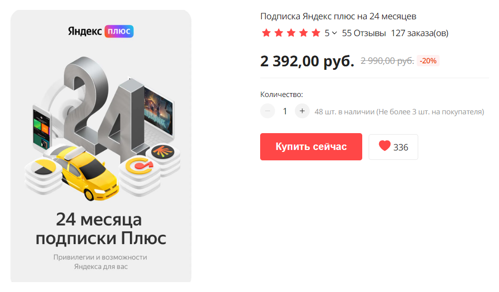 Для тех, у кого "Алиса" или "Кинопоиск": подписка Яндекс плюс на 24 месяца за 50% от "обычной" цены (2392 рубля). У меня получилось ещё и монетками сбросить (итого вышло 2320.24 рубля). Кто не в курсе, обычная цена - 199 рублей в месяц или 4776 рублей за 24 месяца.