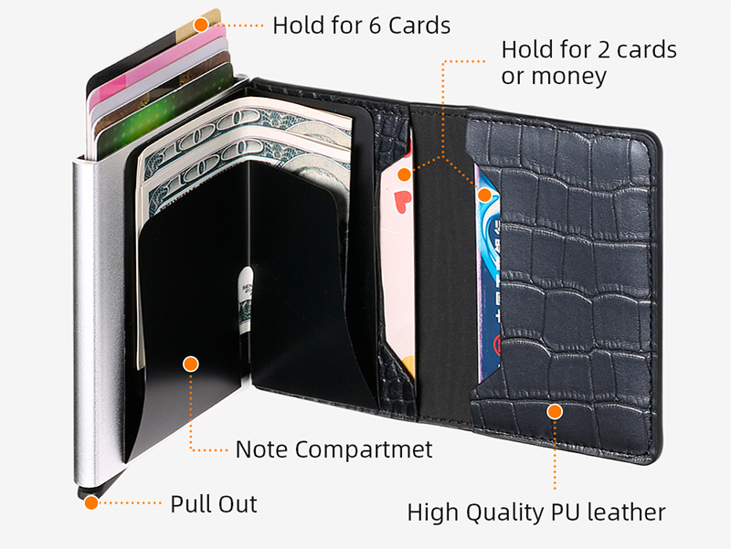 Мужской кожаный кошелек под шесть пластиковых карт и немного налички. Снабжен RFID-блокировкой и механизмом, позволяющим нажатием кнопки выдвигать сразу все карты. Пять расцветок.